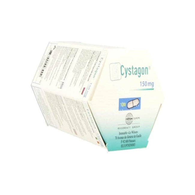 белые, непрозрачные твердые капсулы с надписью CYSTAGON 150 на корпусе и RECORDATI RARE DISEASES на крышке.Упаковка представляет собой картонную коробку характерной шестиугольной формы, внутри которой размещается флакон с 100 капсулами.