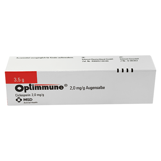 Optimmune — глазная мазь на основе циклоспорина A, предназначенная специально для собак с хроническими поверхностными заболеваниями глаз (например, кератит сухого глаза). Циклоспорин A в концентрации 2 мг/г подавляет локальные иммунные реакции, нормализует слезоотделение и способствует восстановлению целостности роговицы.